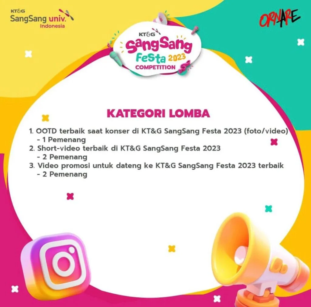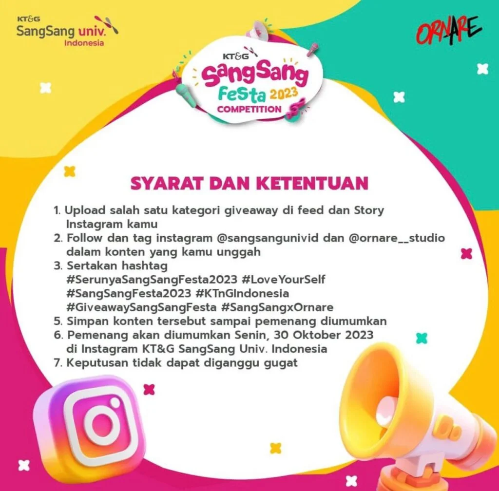 Pengen dapetin merchandisenya? Swipe right posternya. 5 Pemenang akan diumumkan Senin, 30 Oktober 2023 di instagram KT&G SangSang Univ. Indonesia. Pastiin nggak skip semua syaratnya ya. Good luck, SangSang Mates!
