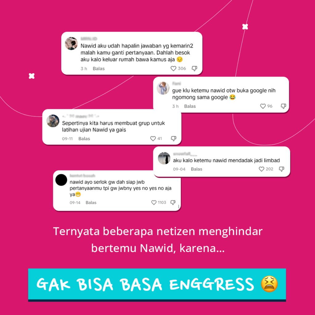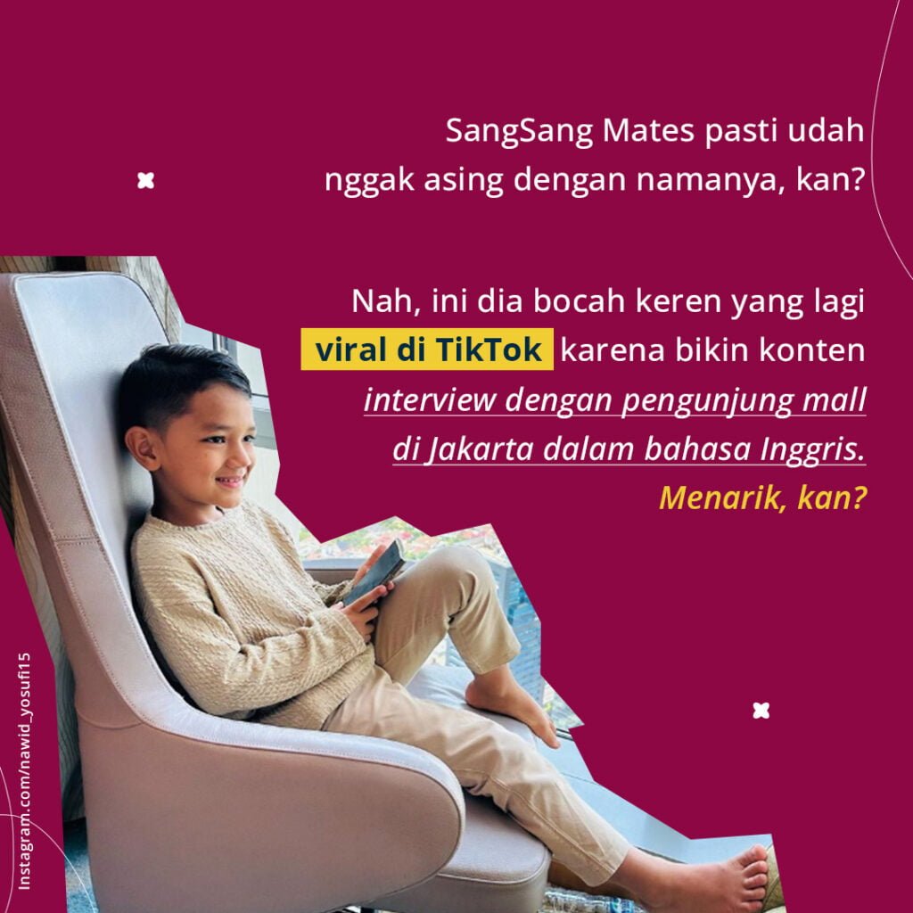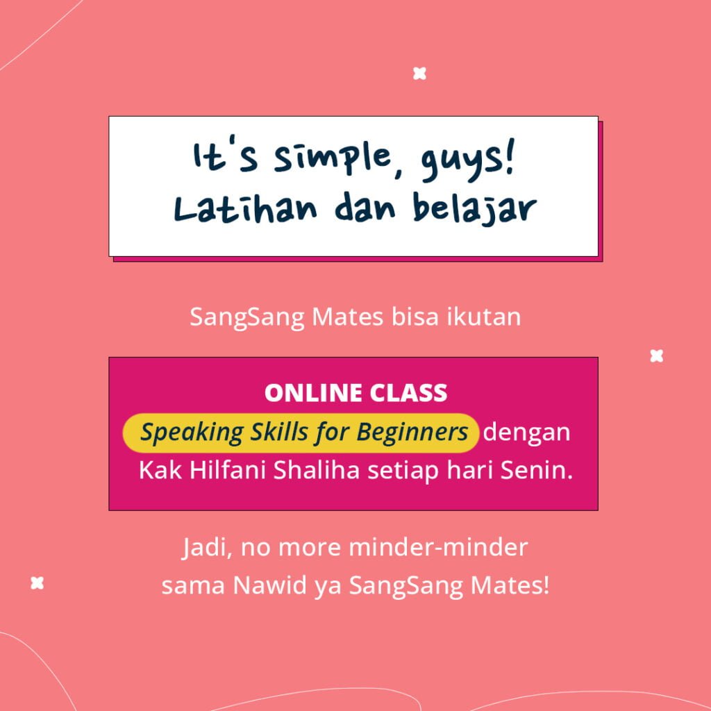 UpdatePraktek English Bareng Nawid Less than a minute to read SangSang Univ October 7, 2023October 6, 2023 Kalian kalo ketemu nawid di mall tim bakal kabur atau mau diwawancara?🤔SangMin kasih tips nih, biar SangSang Mates bisa jawab pas ketemu NawidSangSang Mates bisa ikutan online class speaking skills for beginners dengan Ms. Hilfani Shaliha setiap SeninKuyy daftar kelasnya sekarang, jangan kabur lagi ya😝 SangSang Univ October 7, 2023October 6, 2023Leave a Reply Cancel replyYour email address will not be published. Required fields are marked *CommentName*Email*WebsiteSave my name and email in this browser for the next time I comment. Δ