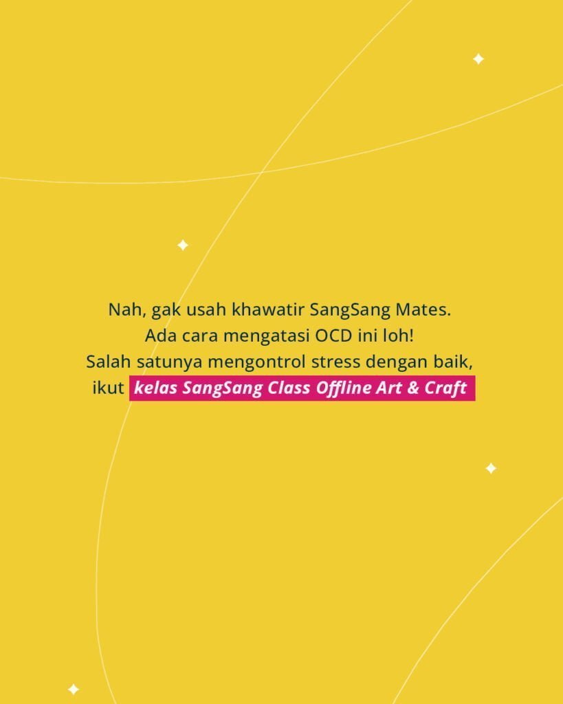 UpdateSuga Pernah Alami Mental OCD? Yu kenali Tanda-Tanda Gejala OCD! Less than a minute to read SangSang Univ November 12, 2023November 12, 2023 SangSang Mates pasti udah gak asing dengan istilah OCD atau Obsessive Compulsive Disorder, kan?Nah, simak tanda-tandanya yuk supaya lebih aware✨ SangSang Univ November 12, 2023November 12, 2023Leave a Reply Cancel replyYour email address will not be published. Required fields are marked *CommentName*Email*WebsiteSave my name and email in this browser for the next time I comment. Δ